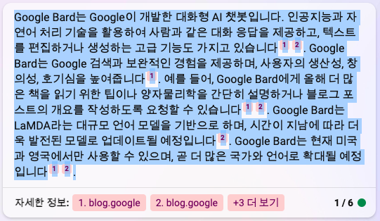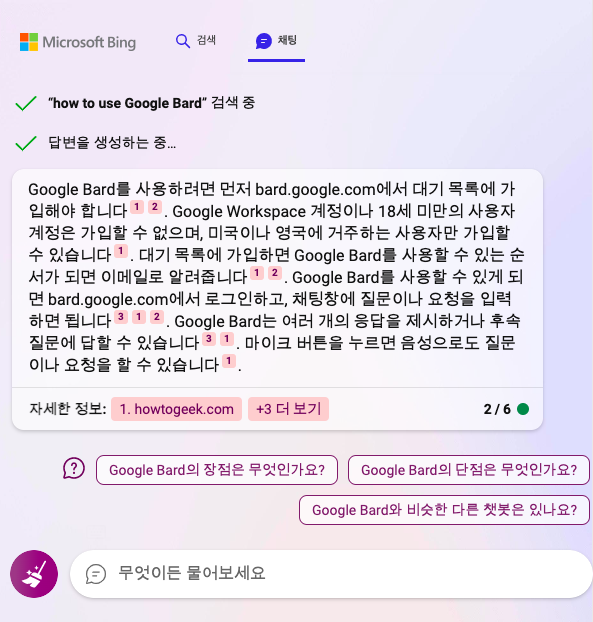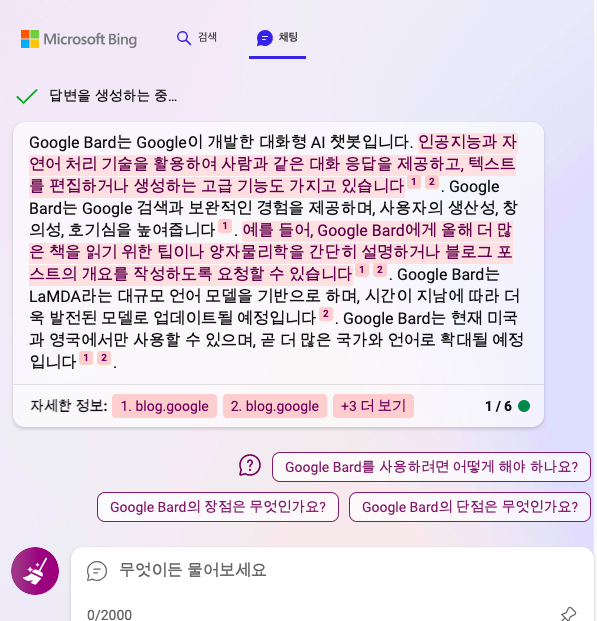 bing 에게 '구글 bard의 장점에 대해서 설명해줘' 라고 질문을 던져보았습니다.