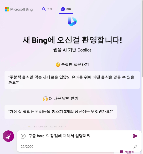 - 2021년도 정보까지만 알려주는 챗 gpt 와 비교했을 때 bing 은 가장 최신정보까지 알려준다는 장점이 있다.