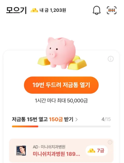 - 1시간마다 한 번씩 저금통 하단에 나와있는 숫자만큼 두드리면 1~50,000 금 사이에 랜덤으로 금을 얻을 수 있습니다.