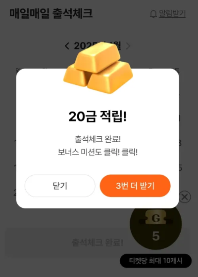 - 매일 출석체크를 하면 20금을 얻을 수 있습니다.